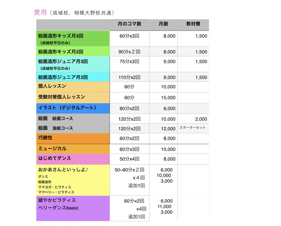 月2回からのお月謝制 全てのレッスン(絵画造形・ダンス・ママヨガ&ピラティス・ママベリー&ピラティス)にご参加いただけます。受講レッスンは月毎に予約制。年度内振替可能。